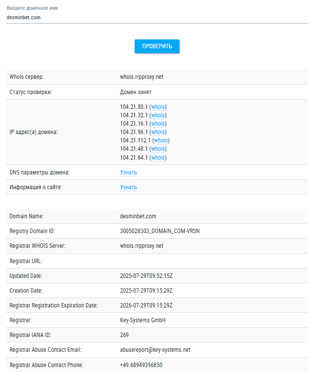 Домен desminbet com зарегистрировали в июле 2025 года, он действителен в течение 12 месяцев. Информация о владельце адреса скрыта настройками приватности.