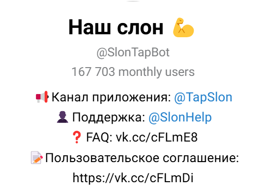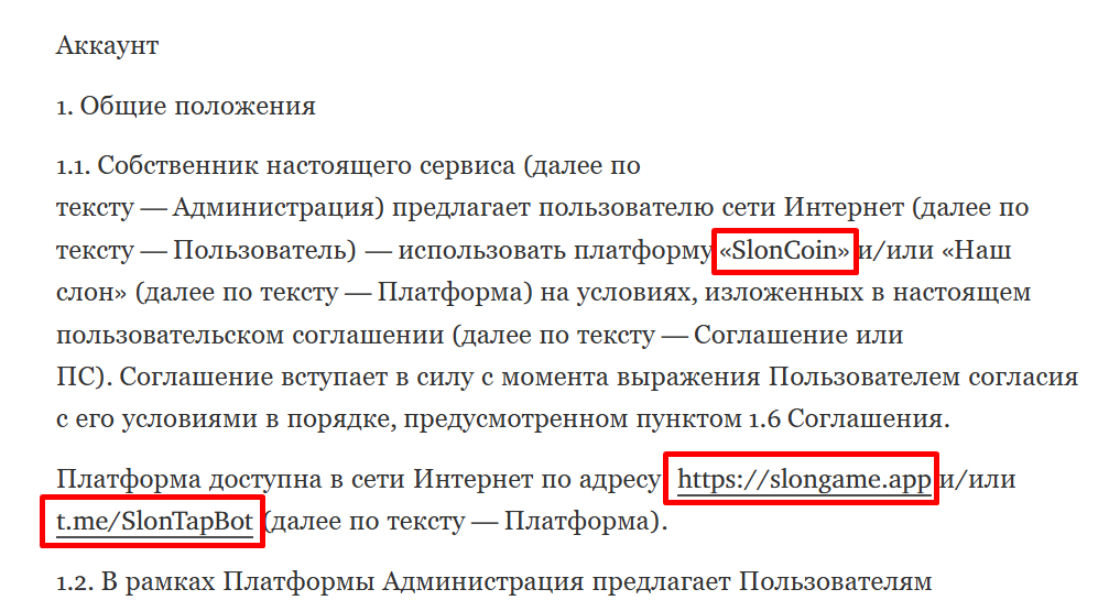 В первом же пункте проекта в общих положениях речь идет о совсем другом кликере SlonCoin, который уже отмечен рядом пользователей как инвестиционная тапалка с мутными перспективами получение прибыли. По оформлению карточек ботов Telegram ясно видно, что у истоков обоих Telegram проектов – Dino tap bot и Slon Coin – стоит один и тот же разработчик.