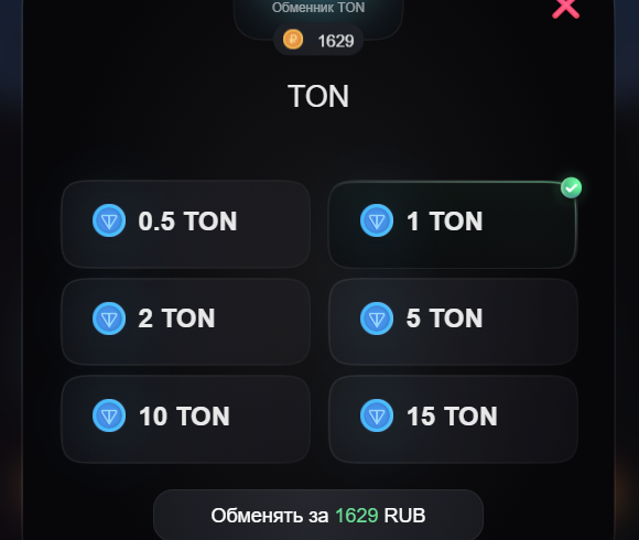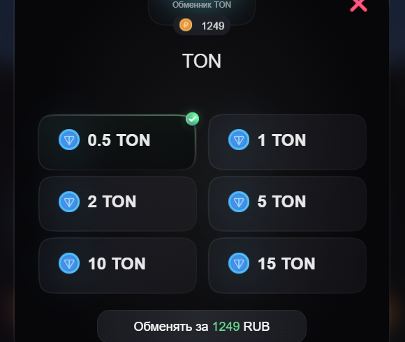 Купить TON можно во внутреннем обменнике площадки. Пользователю предложен следующий, мягко говоря, странный курс – за 0,5 TON нужно оплатить 1249 руб., а цена на 1 TON составляет 1629 руб.