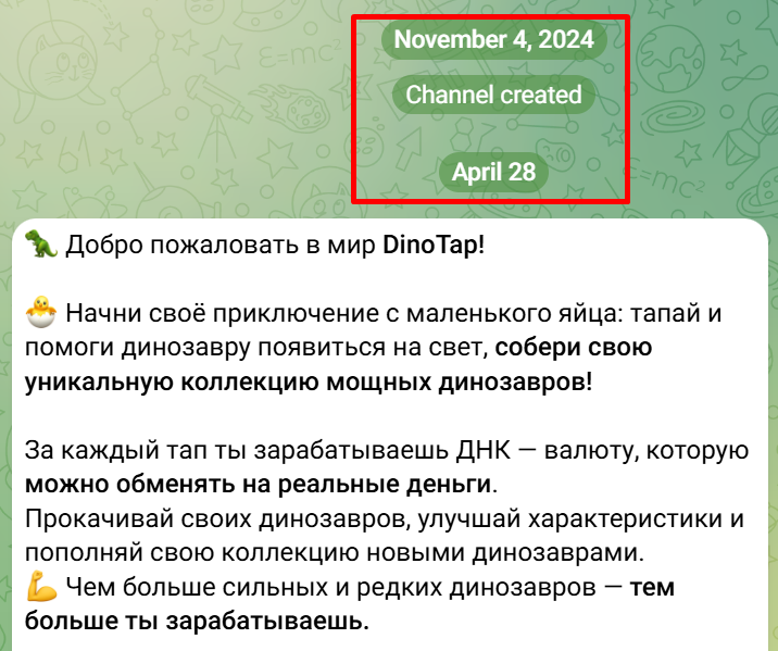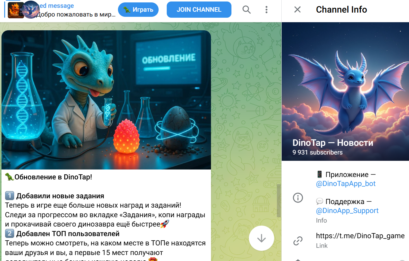Телеграмм канал Dino tap находится по адресу @ DinoTap game. Общая аудитория сообщества составляет свыше 9 тыс. участников, просмотры записей превышают данное количество. При этом на канале около пяти записей, хотя паблик был создан в ноябре 2024 года.