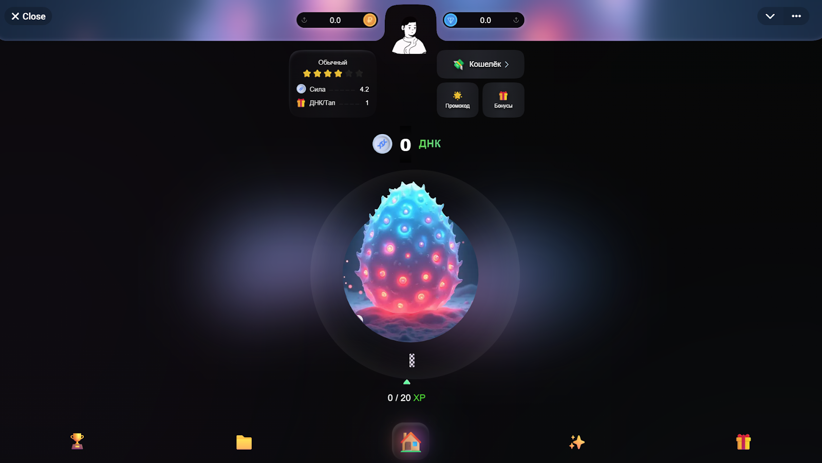 Разделы игрового экрана следующие: лидерборд, коллекция динозавров, основной игровой экран, магазин, реферальная система. За каждый клик по экрану пользователь получает одну единицу ДНК. После открытия динозавра появляется его карточка с описанием силы, ДНК и редкости. Во вкладке кошелек накопленные ДНК сразу конвертируются в рубли, точно так же как и в игре Слон Коин.