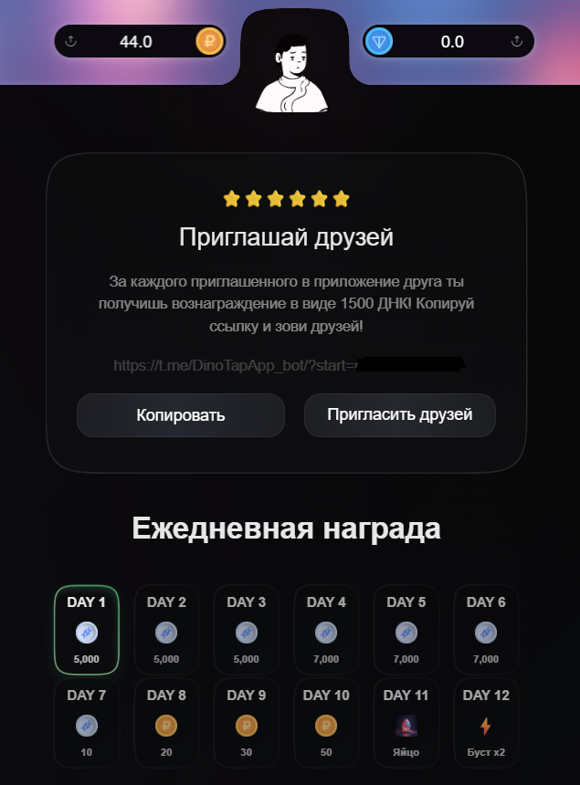 За каждого привлеченного в бот Dino tap реферала пользователю обещают 1500 ДНК. Есть бесплатные бонусы за ежедневное посещение тапалки Дино тап в течение первых 12 дней – они не начисляются автоматически и юзер должен не забыть заклеймить их в соответствующем разделе.
