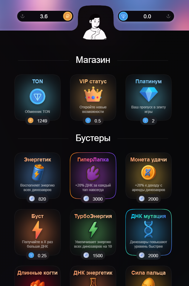 В магазине представлены улучшения, покупка VIP статуса и пропуска в элиту игры за монеты TON, а также бустеры, которые приобретаются за накопленные ДНК.