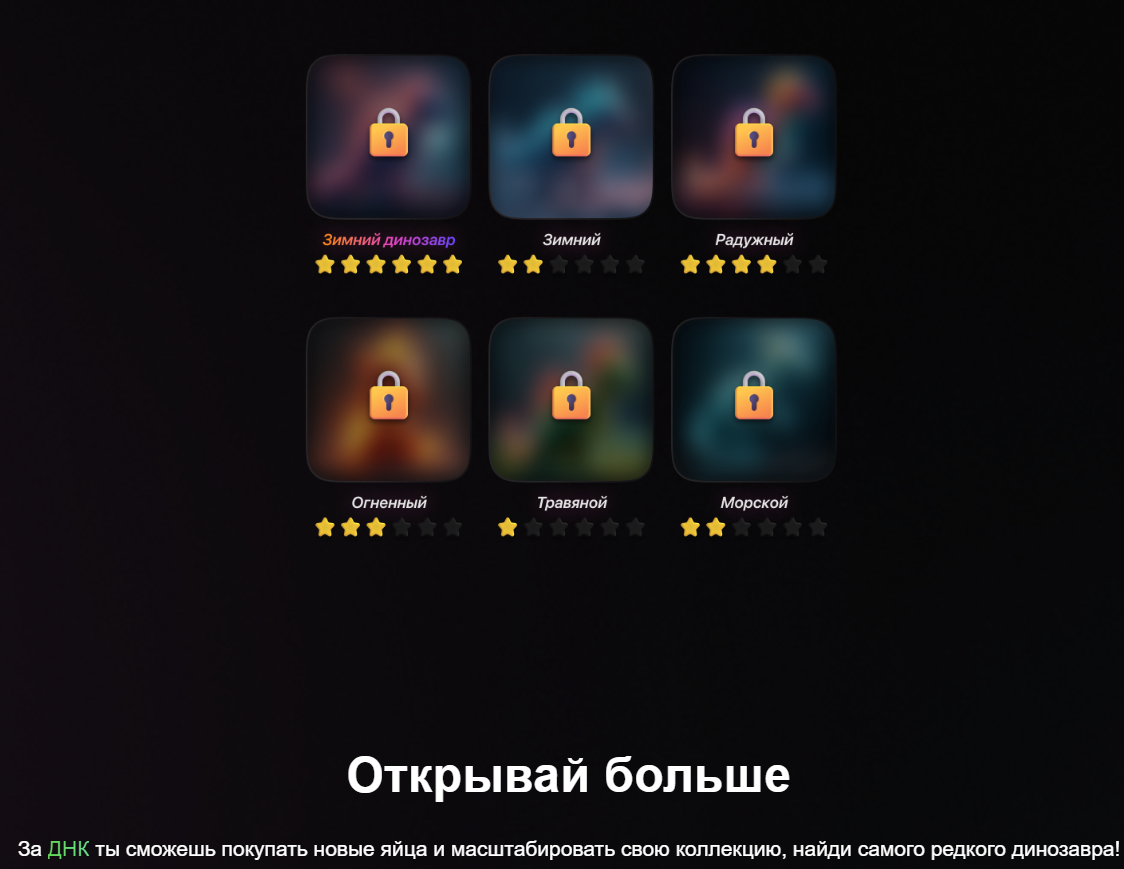 Накопив ДНК, пользователь сможет открывать новых динозавров и пополнять свою коллекцию. Авторы проекта обещают, что среди добытых персонажей будут и очень редкие динозавры.