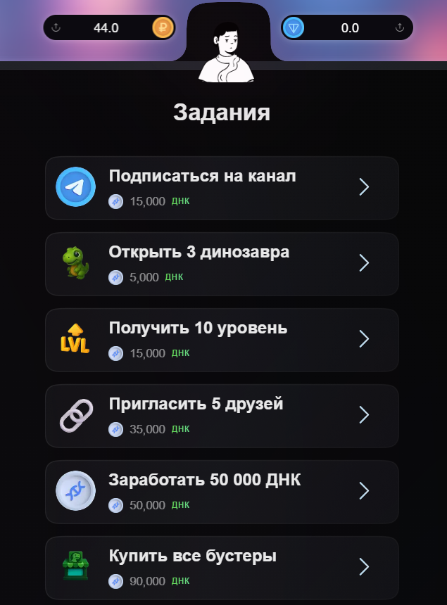 ДНК можно заработать и без кликов, выполняя представленные игровые задания, но их количество ограничено и часть из тасков связана с прогрессом игры. Например, пользователь будет вознагражден за новых динозавров и покупку бустов. Таким образом, заработок в Телеграм игре Dino tap сводится к приобретению усилителей, а в топе лидерборда все же окажутся те, кто купил Премиум статусы, которые в кликере доступны только за дорогостоящие токены TON.