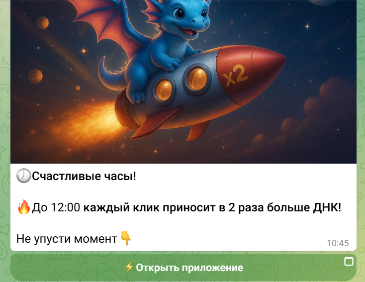 ТГ бот Dinotap регулярно присылают юзеру напоминание о Счастливых часах – в тексте сообщения указывается период, в который клики будут приносить в два раза больше ДНК. Также юзеру напоминают о моментальных ночных выводах которые длятся с 11:00 ночи и до 4:00 утра по Москве. Якобы в этот период все созданные заявки обрабатываются мгновенно.