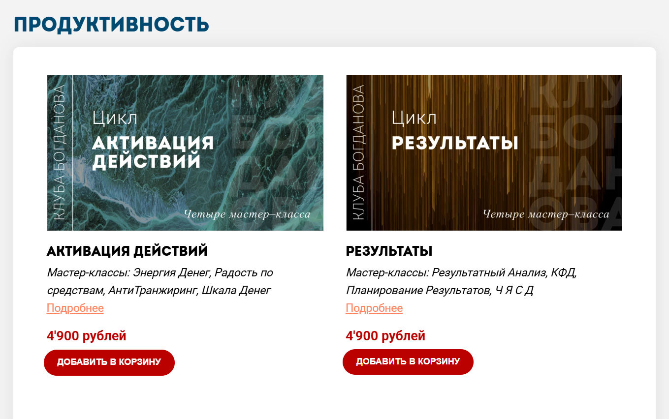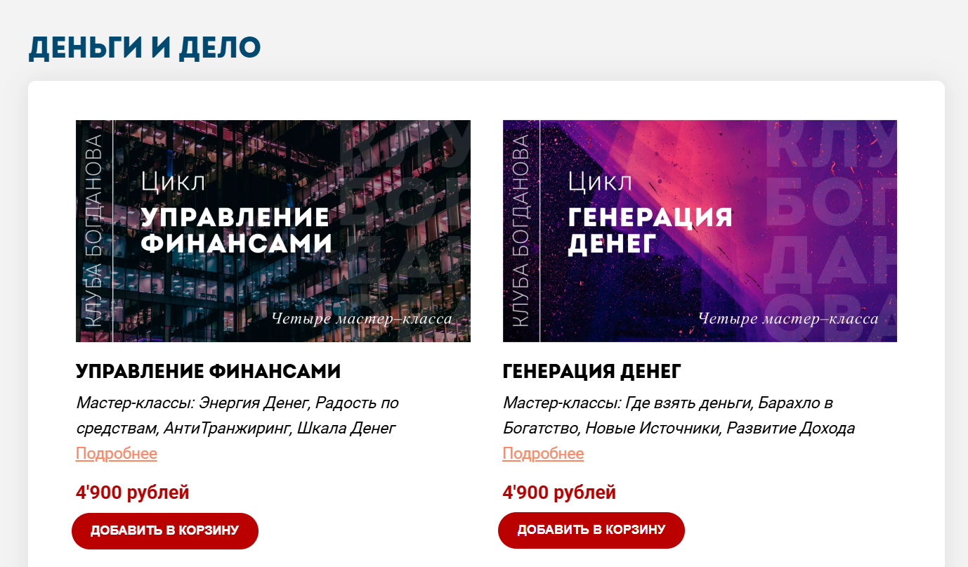 Для новичков создан бесплатный блок из 8 уроков. Это ввод в тему денежного мышления, разбор стереотипов и попытка обучить людей брать ответственность за свое финансовое состояние. Дополнительно доступны короткие тематические тренинги. Они посвящены семейным финансам, выбору пути заработка, избавлению от долгов, поиску своего дела. Стоимость таких мини-курсов меняется, а основной шестинедельный тренинг «Матрица денег» предлагается в нескольких пакетах.