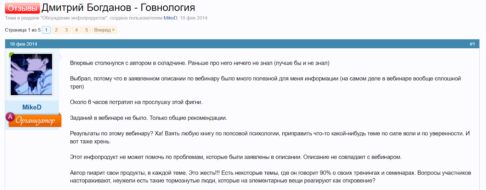При рассмотрении того, какие Дмитрий Богданов отзывы получил на внешних источниках, можно отметить, что многие остаются недовольными качеством обучения. Много негативных откликов говорит о том, что обещанные результаты не достигаются, а рассматриваемый материал оказывается бесполезным. Поэтому достаточно многие клиенты указывают, что Дмитрий Богданов – инфоциган.