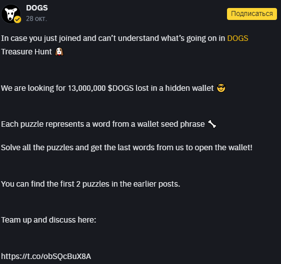 28 октября 2024 года команда Doge запустила новую раздачу токенов. В этот раз все завернули в мини-игру. Пользователям предстоит разгадывать сид-фразу, которая даст доступ к кошельку.