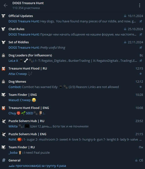 Команда Dogs Treasure Hunt сразу рассказала, как играть. Пользователям предстоит мониторить социальные сети проекта: Insta, Telegram, X и находить спрятанные слова. После того, как все 19 слов будут обнаружены первой командой, конкурс закончится. Записывать свои результаты можно через dogs treasure hunt bot.