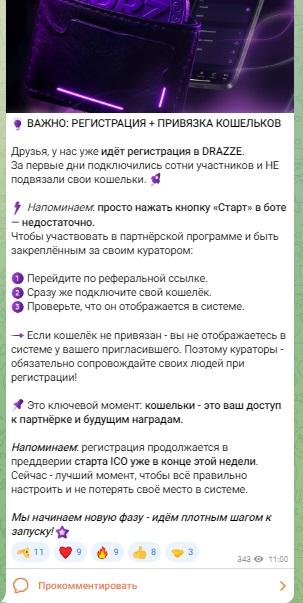Канал DrazzeOfficial функционирует как основной источник информации для участников. Новостные посты сочетаются с техническими руководствами. Активность публикаций неравномерная, что характерно для этапа запуска. Аудитория канала состоит из ранних последователей проекта. Большинство материалов нацелено на мотивацию текущих участников для привлечения рефералов.