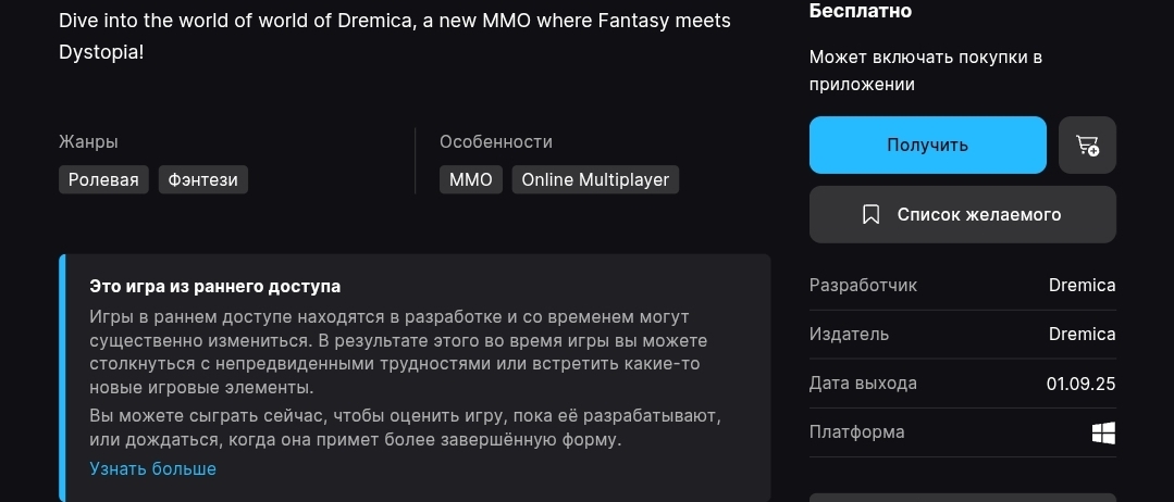 Dremica игра позиционируется как нечто среднее между World of Warcraft и Runescape, но с Web3 экономикой. Для загрузки доступна через Epic Games Store. Платформа сопровождает страницу игры отдельным предупреждением: «Это игра с блокчейном и NFT. Все транзакции осуществляются на риск игрока. Epic Games не поощряет покупку или продажу криптовалюты или цифровых активов». Это официальное дистанцирование крупнейшей игровой платформы от финансовых последствий участия в проекте — момент, который потенциальные участники нередко упускают.