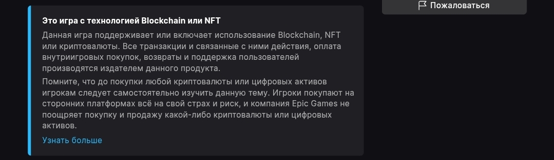 - Epic Games официально предупреждает, что все транзакции с криптоактивами в игре осуществляются на риск игрока и платформа за них ответственности не несет;