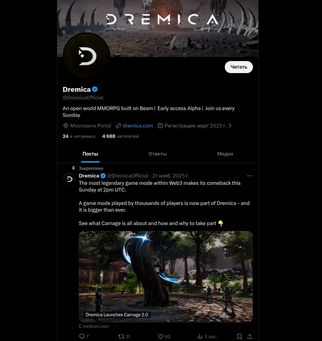 Концепция Dremica возникла в 2021 году. Первые альфа — тесты («Carnage sessions») прошли в 2024 году. На момент написания статьи игра находится в Early Access — то есть продукт официально не завершен и «может существенно измениться». Три года разработки для MMO — срок не критический, однако в сочетании с Web3 механикой и криптоэкономикой это значит, что игроки инвестируют время и деньги в продукт, функциональность и токеномика которого еще не финализированы.