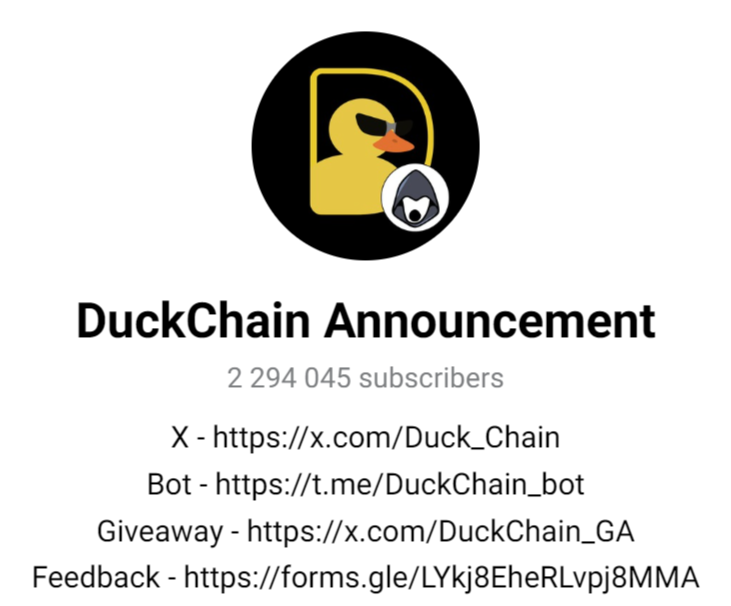 Одним из основных является канал в Telegram, где также приводятся новости по проекту — когда листинг DuckChain. Указывается, какие доступны нововведения, можно ли здесь заработать деньги и т. д. Канал легко найти по ссылке Duckchainann, а сам он собрал аудиторию около 2,29 тыс. человек. Интересно, что в реальности записи смотрит лишь 15-20 тыс. пользователей, что является косвенным фактором накрутки.