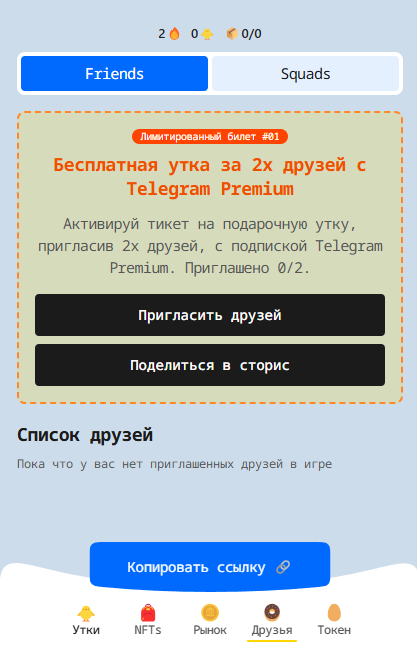 Реферальная система в тг игре Дакиграм устроена странным образом. Игрокам дают подарочный билет на бесплатную утку за 2 приглашения, причем позвать можно только друзей с Telegram Premium, а остальные инвайты не засчитываются. При этом непонятно, во-первых, что за утку дают, т.к. ее доходность нигде не указанных. Во-вторых, неизвестно, что происходит после ее получения: можно ли повторить процесс, изменится ли награда или останется прежней – обо всем этом остается только догадываться.