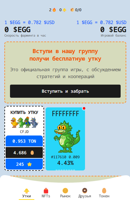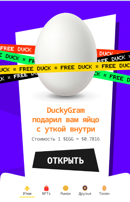 Запустить игру можно в Телеграмме через Duckygram bot. Сразу обозначим, что основной токен здесь – яйца, которые и позволяют зарабатывать уже реальные деньги. У новых пользователей сначала появляется уведомление о начислении приветственного бонуса в размере 1 EGG, что, к слову, приравнивается почти $0,8 – награда действительно приятная.