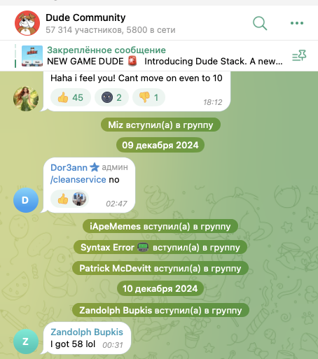 В Telegram есть официальное сообщество игры — Dude Community, DudeMemeCommunity. В нем состоит около 57,3 тысяч участников. Однако, мемберам запрещено отправлять сообщения в ленту.