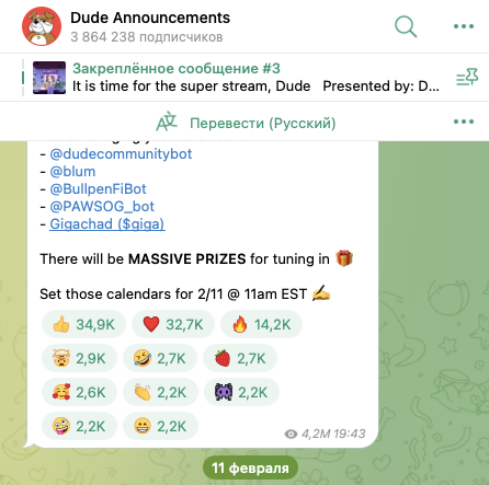 На телеграмм-канал Dude Announcements, DudeAnnouncements, на 3 марта 2025-го года, подписано около 3,9 миллионов пользователей. Публикации просматривают в среднем по 3-4 миллиона раз.