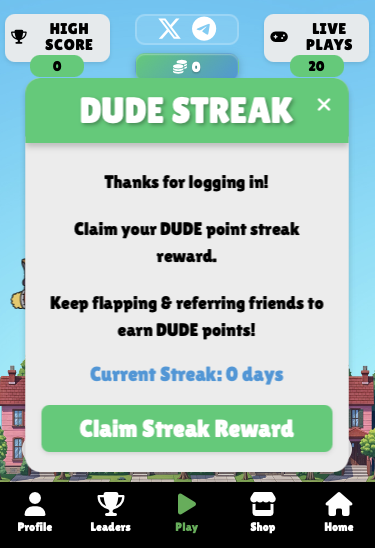 В игре Dude дают награды за ежедневный вход. Каждые сутки пользователь может клеймить по пять Dude Points просто за логин в приложении. Создатели тапалки рекомендуют не пропускать сбор ежедневной премии.Еще один способ получить очки «Дюд» — приглашать в проект новых пользователей. За каждого друга, который зашел в игру по реферальной ссылке, дают по 20 Dude Points.
