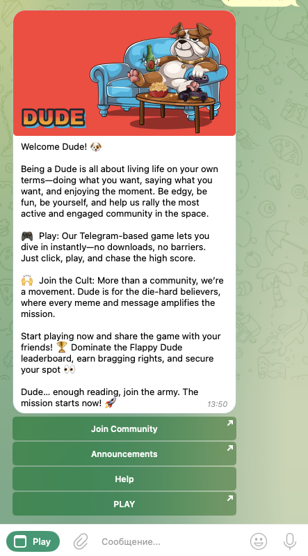 Чтобы запустить игру, сначала нужно зайти в телеграмм-бота dude community bot, dudecommunitybot. После того, как он будет активирован, в чат поступит приветственное сообщение.