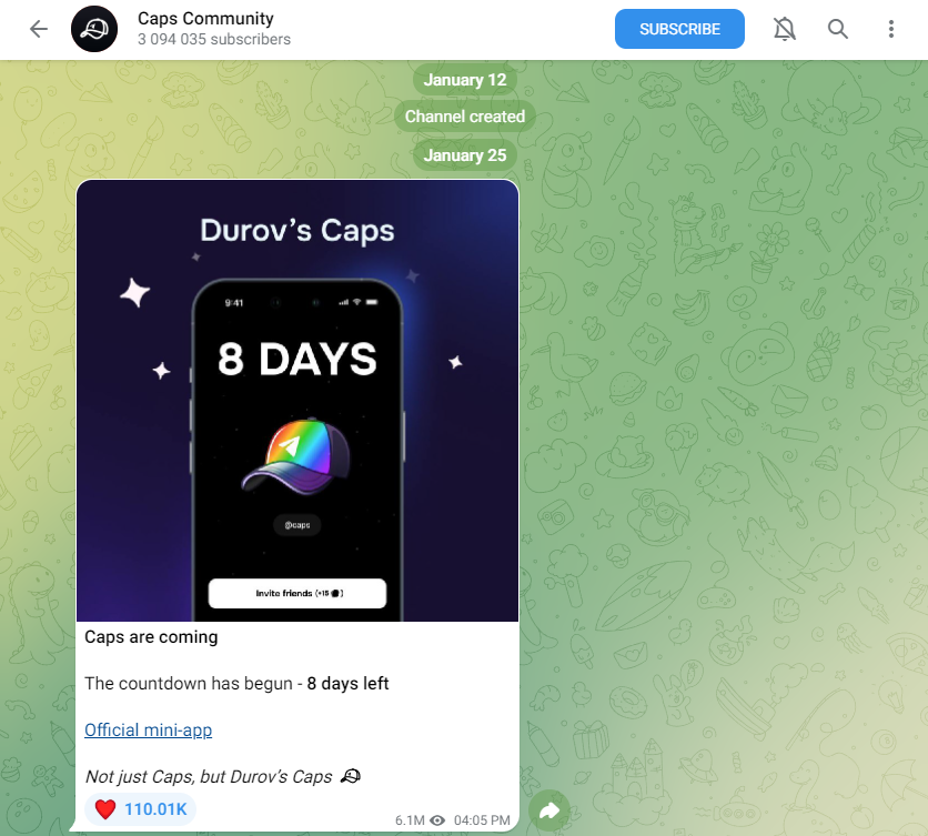 Проект стартовал 25 января, а на данный момент уже насчитывает более 3 миллионов участников в телеграм канале Caps channel и 11 миллионов тг боте Durov Caps, однако такой резкий рост аудитории ДуровКапс может указывать на накрутку.