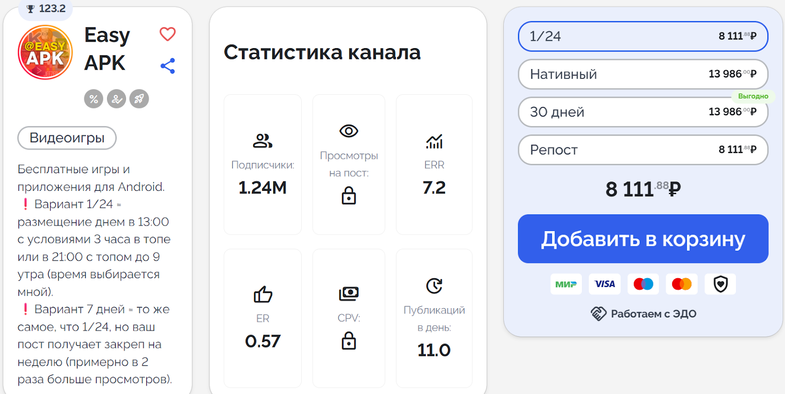 Почти все игры и программы в ТГК Easy apk распространяются через прямое скачивание. Также отметим, что ранее некоторые ссылки давались и на официальную платформу Google play. Проект монетизируется за счет рекламы. Размещение на сутки начинается от 8 тыс. руб.