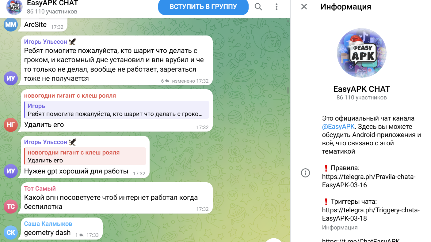 К ТГ каналу Изи апк привязан Телеграмм чат – Chat easy apk, @ ChatEasyAPK. На время написания обзора в группе состоит свыше 86 тыс. участников.