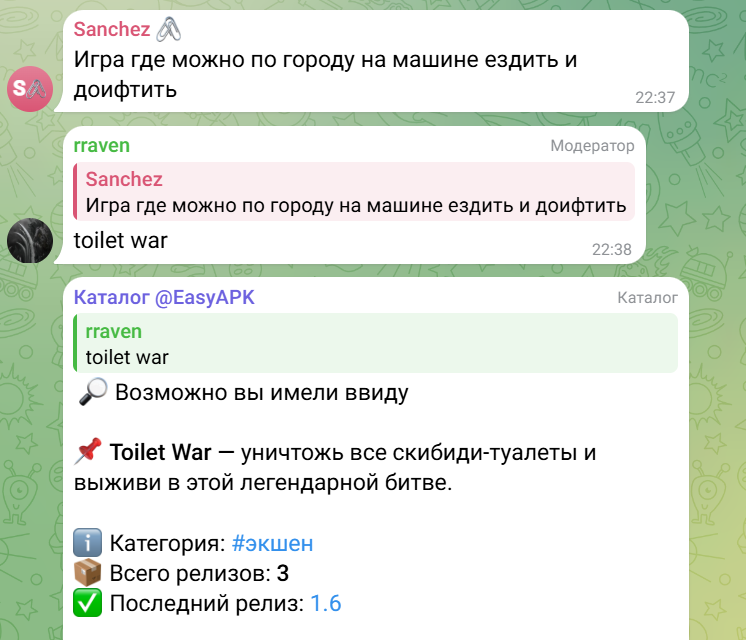 У ТГК Изи апк есть бот с каталогом приложений – @ EasyAPKBot. Подбор нужного APK осуществляется также бесплатно.