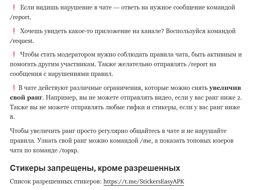 В отдельных документах на платформе Телеграф опубликованы правила и триггеры чата. Подписчики ТГ канала Изиапк могут повышать свой ранг, регулярно общаясь в чате, и, соответственно, ранг будет понижен если за юзером замечено нарушение. Ранги влияют на возможности пользователя. К примеру, участник с рангом выше 8 может отправлять любые гифки и стикеры. Также заметим, что пользователи Chat easy apk могут отправлять в Telegram группе любые файлы АПК, однако продавать здесь что-либо запрещено.В Телеграмм канале Изи апк есть гайды и видео инструкции. К примеру, разъяснение как установить игру, к которой прилагается кэш, было опубликовано в ленте Телеграм канала Изи апк еще в 2018 году.
