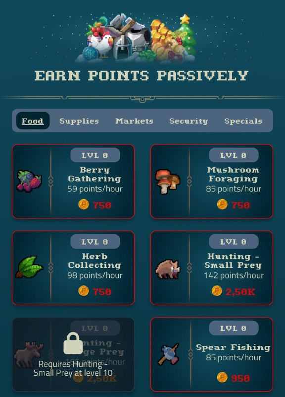 Второй путь — начать пассивно зарабатывать токены в Elderglade Game. Как и в Homstar Combat, на выбор предлагается несколько карточек для улучшений. Чем больше вложения в какое-то предприятие, тем больше оно приносит крипты в час.