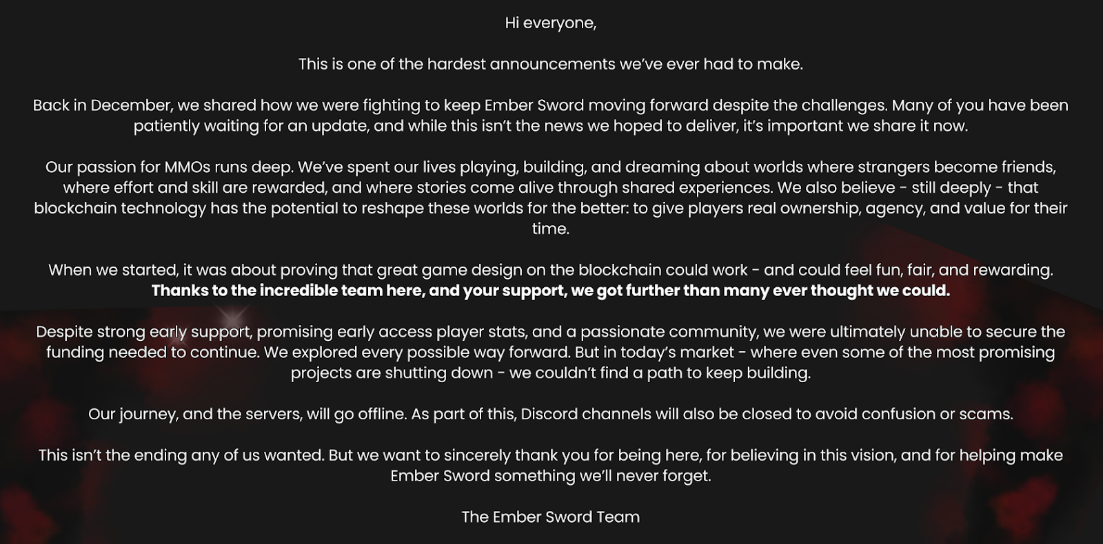 Официальный сайт игры embersword com все еще поддерживается. Разработчики выложили свою версию событий на официальном портале и официально попрощались с проектом.По заявлениям разработчиков, они не виноваты. Команда просто не смогла найти финансирование над продолжением работы. Проблема в том, что $200 000 000 на то, чтобы создать изометрическую РПГ с ужасным геймплеем — это, итак, очень много.