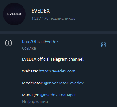 Юридической информации и подтвержденных данных о владельцах нет. Есть только телеграм-канал с 1 200 000 подписчиками. Адрес — @officialEveDex. Аккаунты для связи — Evedex_Manager и Moderator_Evedex.