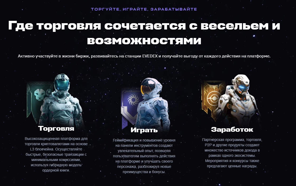 Биржа Evedex позиционируется как гибридный проект. С одной стороны — торговля криптовалютами, с другой — запуск тапалок и прочих приложений. Официальный сайт — evedex com.