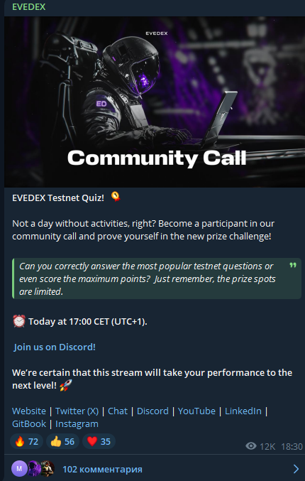 Аккаунт в соцсети X — EveDexOfficial. Других социальных сетей нет. Разработчики даже не показывают свои аккаунты. Странное поведение от «биржи нового поколения».