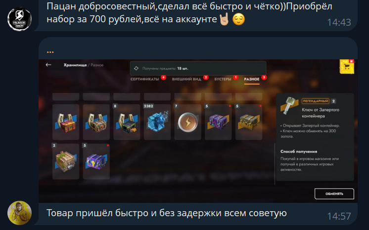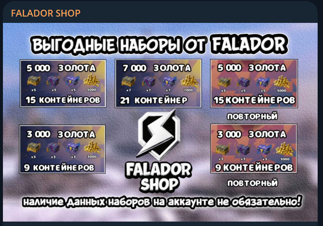 В магазине, который сделан в ТГК Faladorshop представлен всего один пост, но в нем расписаны все условия приобретения. Тут приводится детальное описание доступных наборов, что помогает выбрать подходящий вариант. Люди могут приобрести наборы на Lesta ru, их стоимость начинается от 400 рублей. За самый дешевый вариант клиент получает 9 контейнеров и 3 тысячи золотых монет. Этот набор доступен для повторной покупки, но тогда стоимость будет уже не 400 рублей, а 849 рублей. Также рекомендуется уточнять наличие товара перед покупкой.