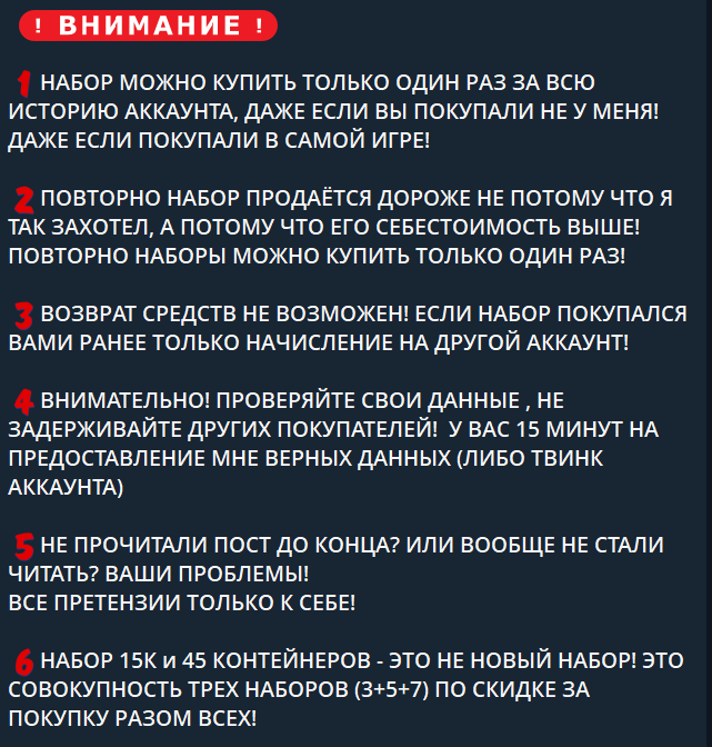 Покупая набор за 699 рублей можно получить 5 тысяч золота, 15 контейнеров, представленные из трех видов по 5 штук каждого. При повторной покупке цена будет также 849. Более дорогой набор стоит 949 рублей и он уже не доступен для повторной покупки. В него входит 7 тысяч золота и 21 контейнер. Самый дорогой вариант стоит 2,6 тысяч рублей, включает в себя 60 контейнеров и 2 тысячи золотых монет.