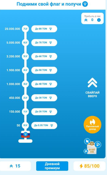 Чем выше ваш уровень в тапалке Flagton, тем больше токенов TON вы сможете получить. Например для того, чтобы выбраться с 0-го уровня, вам потребуется 50 свайпов. После чего вам начислятся 0,05 TON.