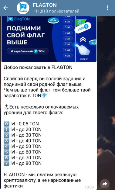 Flagton 一 обзор на телеграмм-приложение нужно начать с того, что игра появилась только 23 января и только собирает свою аудиторию. Ее основное предложение 一 заработок TON на так называемых «свайпах».