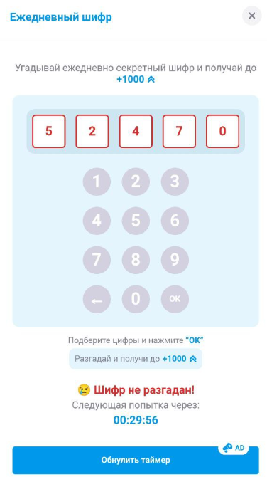 Обнулить этот таймер можно с помощью просмотра рекламного ролика. Если же вам удастся угадать шифр Flag ton, то это принесет вам сразу 1000 свайпов.