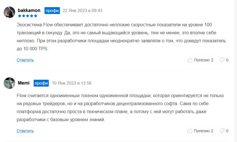 Положительные отзывы касаются удобства работы с NFT-платформами. Критика в адрес Flow касается ограниченной интеграции с биржами. Пользователи недовольны тем, что кошельков с полной поддержкой сети пока еще мало. В целом, проект получает высокие оценки от пользователей, работающих в сфере NFT и Web3-игр. Однако для более широкого распространения необходима активизация в области финансовых решений.