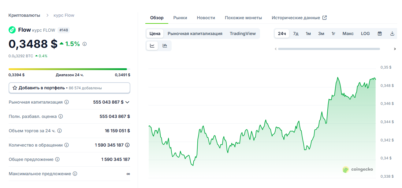 На 19 июня 2025 года цена криптовалюты Флоу составляет 0.3483 USD (курс flow к рублю — около 26,85 рублей за 1 монетку). Рыночная капитализация — $553 853 679. В обращении находится 1 566 649 989 токенов. Объем торгов за 24 часа — $13 825 032. Максимальное предложение ограничено — 1 499 068 195 токенов, что делает токен независимым от инфляции. FLOW торгуется на Binance, OKX, Bybit, Bitget, BingX. Основные пары: FLOW/USDT, FLOW/BTC, FLOW/ETH.
