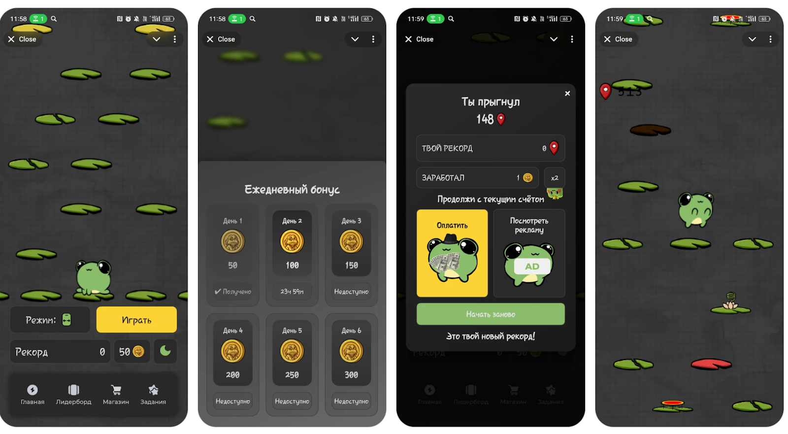 3. Играть. Запускает игровой процесс. В дальнейшем бот Froggy Jump в ТГ показывает текущий рекорд и размер заработка. Параллельно пользователю предлагают оплатить счет или посмотреть рекламу для новой покупки.