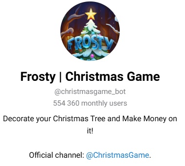 Frosty Christmas Game – телеграмм-бот, представляющий из себя тапалку для выбивания игровых очков в виде хлопьев или снежинок, которые в дальнейшем можно будет обменять на внутренний токен игры.