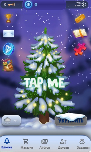 - Активный сбор. Для получения необходимо нажимать на елку во время падения снежинок.