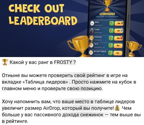 По словам создателей игры, общий размер аирдропа токенов будет составлять 5 000 000 $FROSTY. Часть аирдропа будет распределяться по результатам нескольких турниров, проходящих в рамках проекта, в зависимости от места в рейтинге лидеров. Выплаты получат первые ТОП-100 игроков.