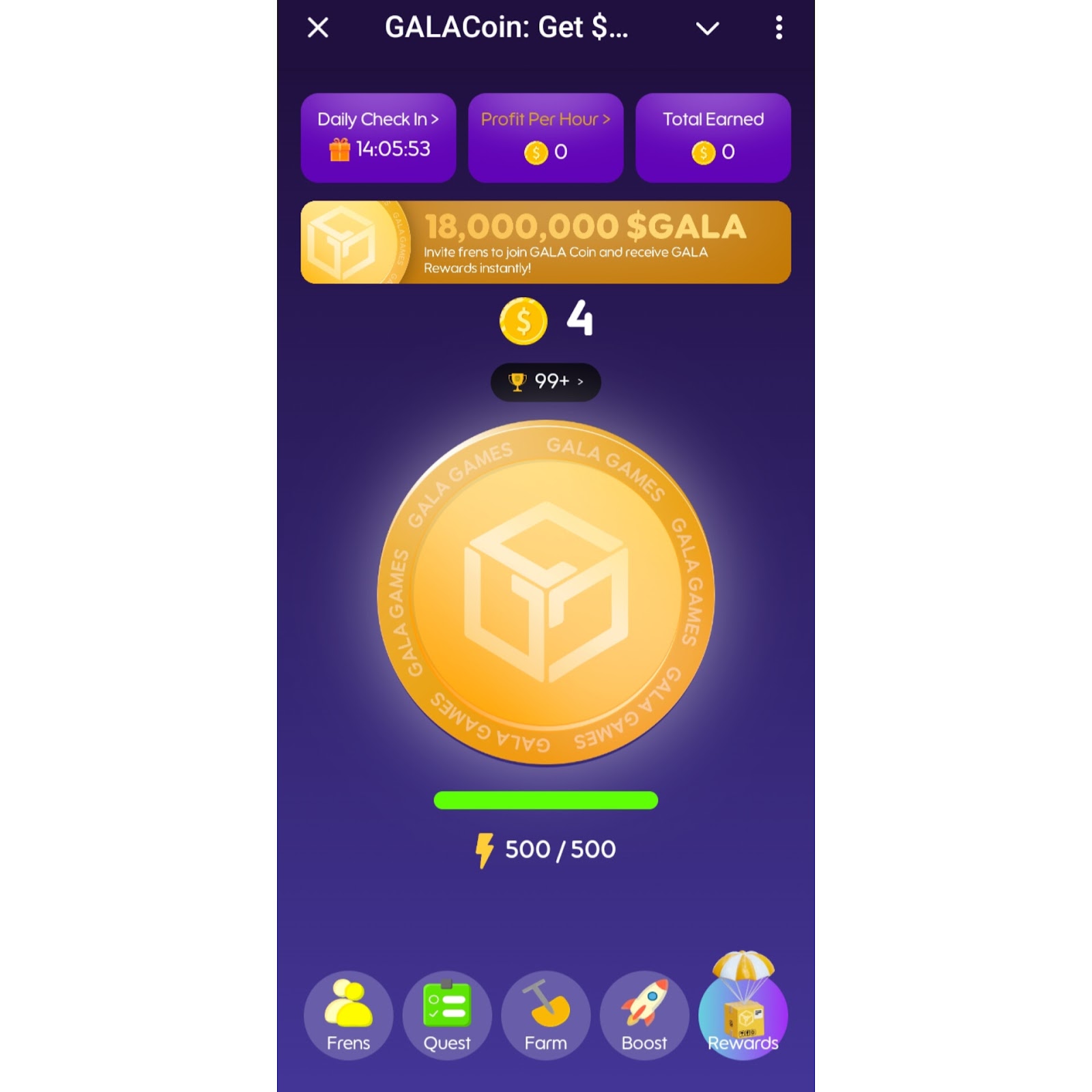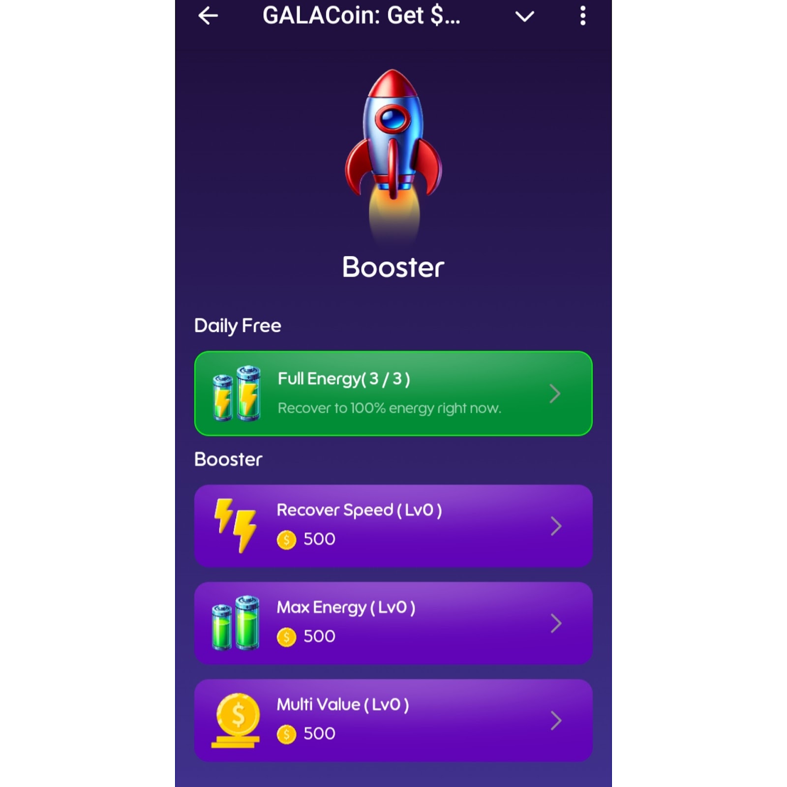 Всем игрокам доступно 500 энергии. Она уменьшается с каждым нажатием. Для того чтобы увеличить скорость получения коинов, можно использовать бустеры. Пользователям доступны как бесплатные, так и платные улучшения. К первым относится ежедневное восстановление энергии. Игроки могут его использовать 3 раза в 24 часа. Из платных бустов в игре тапалке Гала Коин доступны: