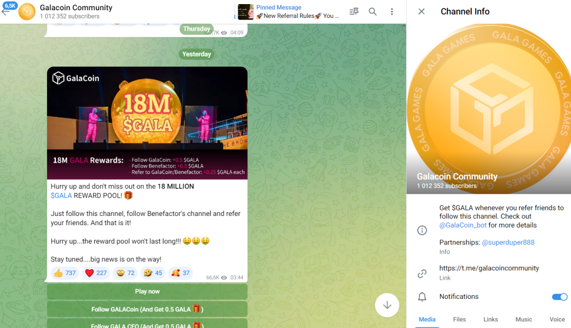 Узнать об актуальных обновлениях игры можно с помощью Телеграмм-канала Galacoin Community. Его аудитория — 1 млн пользователей.