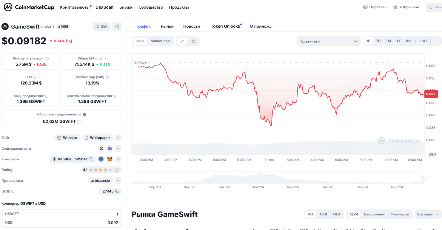 Токен GSWIFT торгуется на топовых криптовалютных биржах и имеет следующие характеристики: