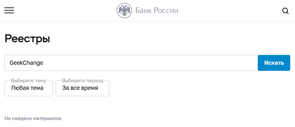Сведения о лицензии на сайте не приведены, что указывает на отсутствие разрешительных документов. Проверка через реестры Центробанка России дает понять, что деятельность Geek Change не регулируется законом, а, значит, ее можно признать нелегальной в стране.
